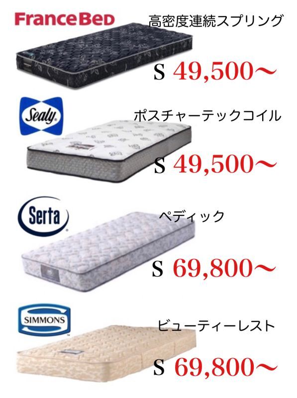 | ブランド | シモンズ、サータ、シーリー、テンピュール スランバーランド、フランスベッド、マニフレックス 日本ベッド、ドリームベッド、カリモクベッド スターンズ&フォスター、ルフ、東京ベッド、チヨダ パラマウント、センベラ、シェララフィア、グランツ ベルベル、イワタ |